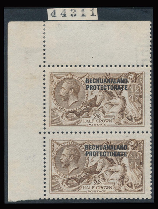 | Zusatzinformationen und Suchstichworte: | Doreen Royan & Associates Shop - Online Los 750884 (D) Betschuanaland Bechuanaland 1916-1919 King George V ‘Seahorse’. 2/6d. sepia. De La Rue printing. Overprinted on Great Britain with SG Type 21. North West corner vertical pair. Variety on lower stamp, ‘Re-entry (R2/1)’. Superb mint condition. British Philatelic Association Certificate No. 44,311 (1961). EXCEEDINGLY RARE Festpreis 3.500,00 GBP |