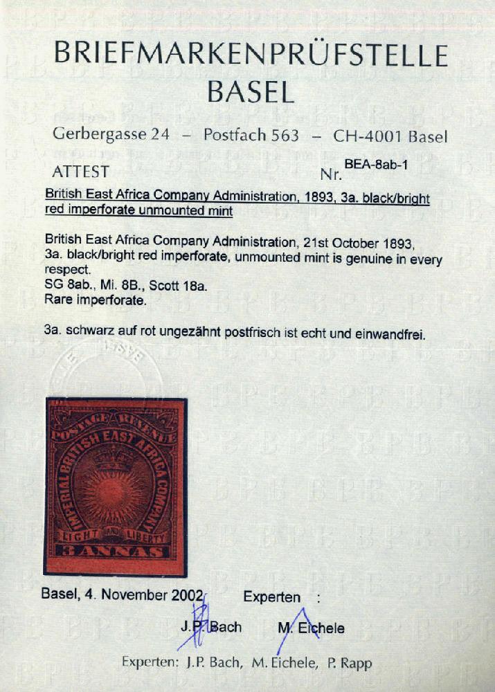 | Zusatzinformationen und Suchstichworte: | 73. AAK Phila GmbH Auktion Auktionstermin: 7. Mai 2022 Los 1044 (D) Britisch Ostafrika 3 A schwarz a. rot, ungezähnt, u.E. ungebr. vollrandig Luxus und auch so bewertet m. einwandfreiem Attest BPSB für eine postfr. Marke! Katalogpreis: 800+,- EUR Ausruf 160,00 EUR |