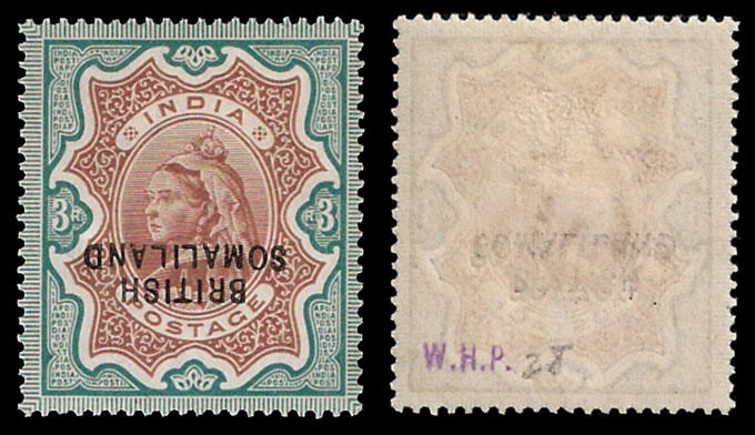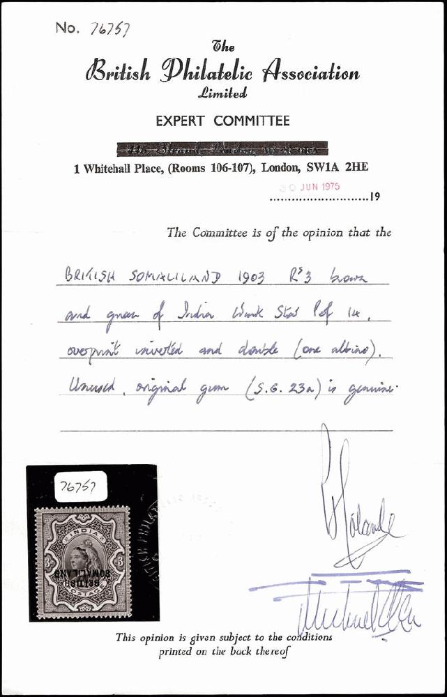 | Zusatzinformationen und Suchstichworte: | Filat AG Shop Neu Los 663 (D) Britisch Somaliland 1903 Ovpt at bottom 3r OVERPRINT DOUBLE, BOTH INVERTED, ONE ALBINO (SG 23a). VF/M example of this interesting and attractive variety. A key stamp, few can exist as only 1485 of the basic stamp issued. Photo-cert: BPA. (cv£950) Festpreis 1285,00 CHF |