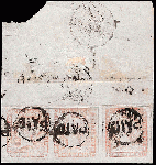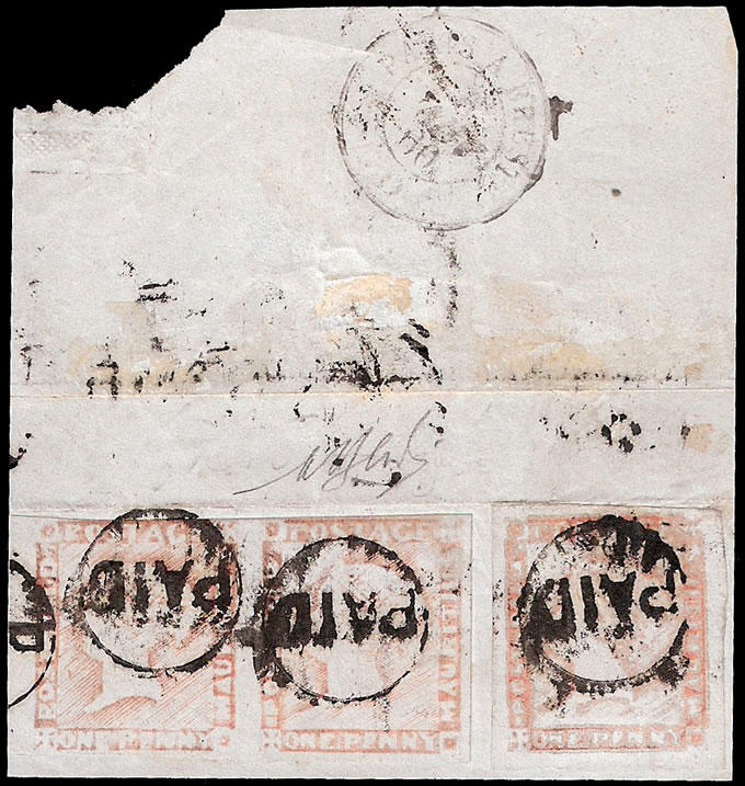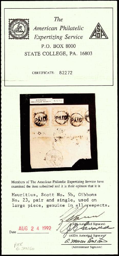 | Zusatzinformationen und Suchstichworte: | Filat AG Shop Neu Los 1219 (D) Mauritius 1859 LATEST IMPRESSIONS: 1d red (SG 23). A pair and a single used horizontally together on letter fragment soundly cancelled "PAID" in circle. Adjoining cds dates use to 1860. The pair with clear margins just touching at top; the single full margins all round. Perfect illustration of the worn plate characteristic of this the last of the Primitive printings; blue-greyish paper. Attractive representation this classic issue. Rare. (cv£2400+). Photo-cert: APS; Signed: Bloch. See clickable image of certificate below Festpreis 1.585,00 CHF |