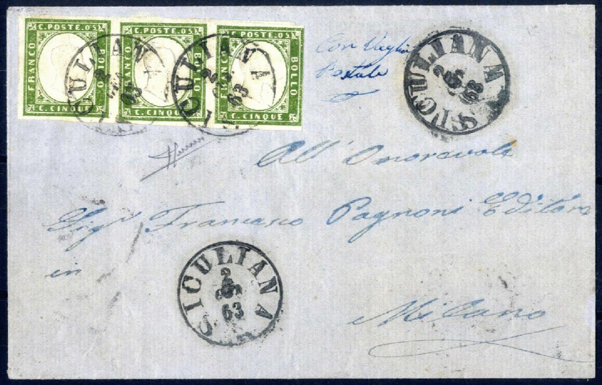 | Zusatzinformationen und Suchstichworte: | 73. Viennafil Live-Auktion Auktionstermin: 31. Mai - 3. Juni 2022 Los 937 Italien Staaten Sardinien 1863, lettera da Siculiana (Punti 7) il 2.1 per Milano affrancata con IV di Sardegna striscia di tre 5 c. verde oliva, cert. Sorani, Sass. 13 C / 12600,- Ausruf 1.120,00 EUR |