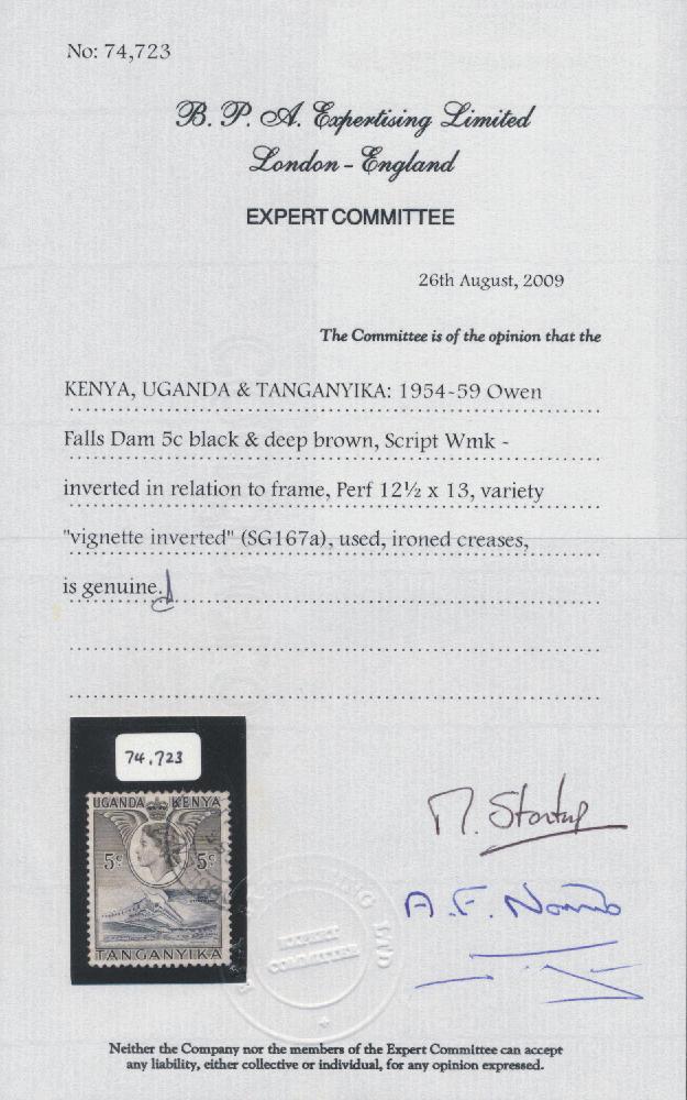 | Zusatzinformationen und Suchstichworte: | Doreen Royan & Associates Shop - Online Los 751073 (D) Ostafrikanische Gemeinschaft Kenya, Uganda and Tanganyika 1954 Queen Elizabeth II Owen Falls Dam. 5c. black and deep brown. Error, ‘Vignette Inverted (Dam) and Watermark Inverted’. Superb used condition, cancelled in 1955 at ‘Wobulenzi’, a small village 25 miles from Kampala, Uganda. Well centred with strong colours. A couple of mild horizontal creases, not detracting. Royal Philatelic Society, London, Certificate No. 50,141 (1960). British Philatelic Association, London, Certificate No. 74,723 (2009). THIS IS THE UNIQUE EXAMPLE OF THIS FASCINATING AND STORIED INVERTED STAMP. THIS IS UNDOUBTEDLY ONE OF THE MOST IMPORTANT STAMPS IN THE WORLD. (Scott 103b) Preis auf Anfrage |