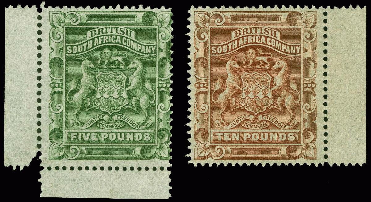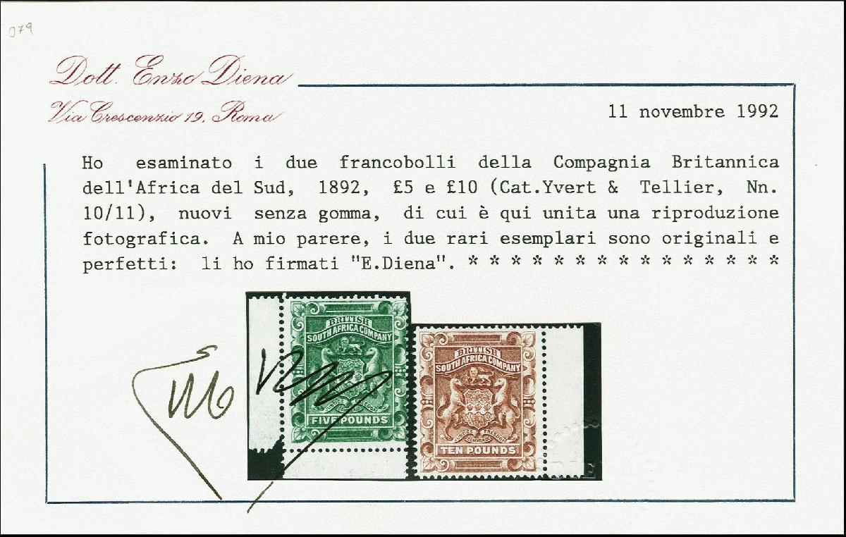 | Zusatzinformationen und Suchstichworte: | H. R. Harmer Auktion 3057 bis 3060 - Spring 2022 Auktionstermin: 22. - 23. Juni 2022 Los 1204 Rhodesien 18-19,1892 £5, £10 Wappen, Randstücke, ungebraucht, feinst bis Pracht; jede signiert "ED" (Diena) und mit seinem 1992 Attest für das Paar (Scott $4,775 für Originalgummi; SG 12-13, £4,350 für Originalgummi) Ausruf 200,00 USD |