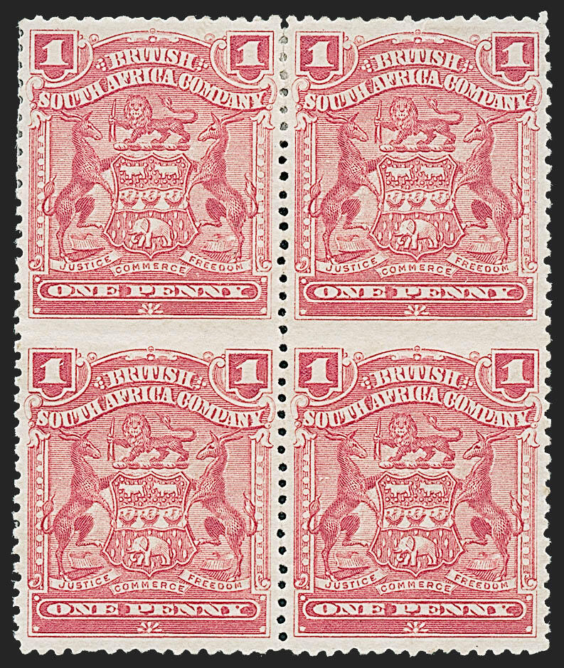 | Zusatzinformationen und Suchstichworte: | Robert A. Siegel - Worldwide Stamps and Postal History Auktionstermin: 21. - 23. Juni 2022 Los 4687 Rhodesien RHODESIA, 1898,1p rosa, senkrechtes Paar, dazwischen ungezähnt (60b; SG 77b). Viererblock, Originalgummi, obere Marken Falzrest untere Marken kleiner Falz, farbfrisch, waagrechter Knick zwischen den Marken, einige oberflächlich falzhelle Stellen berührt beide Paare, sehr gute Wirkung, mit 2022 B. P. A. Attest, katalogisiert als zwei Paare, Scott $1,650,00, SG £1,100 Ausruf 400,00 USD |
