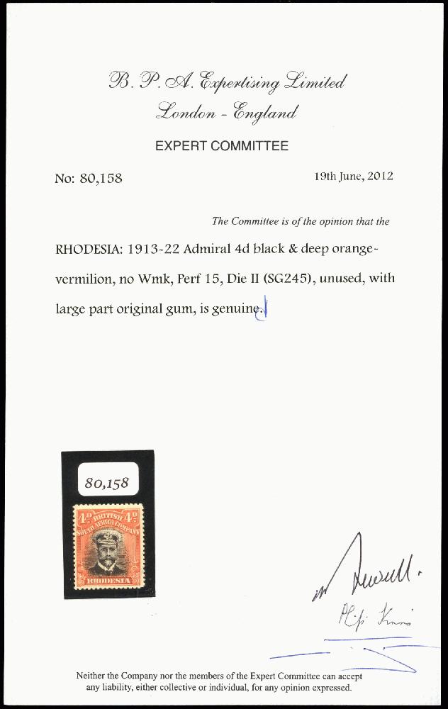 | Zusatzinformationen und Suchstichworte: | Stanley Gibbons - The David Spivack Admiral Collection - Part 1 Auktionstermin: 6. Juli 2022 Los 71 Rhodesien 1913-7 4d Head Die II, perf 15. A very fine o.g. example, BPA Certificate (2012), ex Montgomery. SG 245, AH 2b - Est £700-£800 Ausruf 95,00 GBP |
