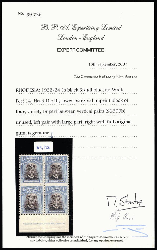 | Zusatzinformationen und Suchstichworte: | Stanley Gibbons - The David Spivack Admiral Collection - Part 1 Auktionstermin: 6. Juli 2022 Los 225 Rhodesien 1922-4 1/- Head Die IIIB, perf 14, white paper. Mint lower marginal imprint block of four, two vertical pairs each imperforate between; the left pair with one stamp large part o.g., the right pair unmounted o.g. The selvedge lightly creased below the imprint, and a tiny mark between the left stamps, otherwise very fine. A splendid multiple, containing two of the ten possible pairs, a key Admiral and British Africa rarity. Ex County and Vestey (front cover illustration in both sales), BPA Certificate (2007). SG 300b, AH 16 Var - Est £30000-£35000 Ausruf 24.000,00 GBP |