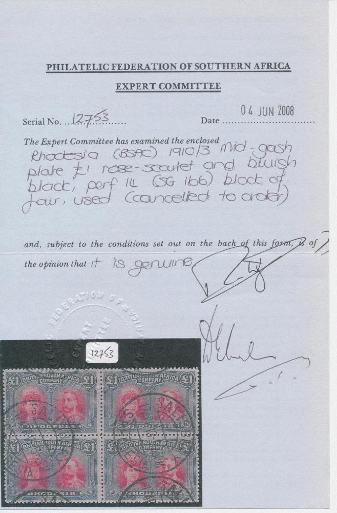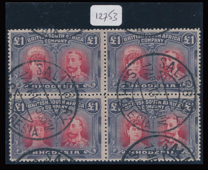 | Zusatzinformationen und Suchstichworte: | Doreen Royan & Associates Shop - Online Los 750197 Rhodesien Rhodesia. 1910-1913 King George V Double Heads. £1 rose-scarlet & bluish black. Block of four. Perf 14. Superb used condition (CTO). Philatelic Federation of South Africa Certificate No. 12,753 (2008). OUTSTANDING AND RARE Ausruf 1.500,00 GBP |
