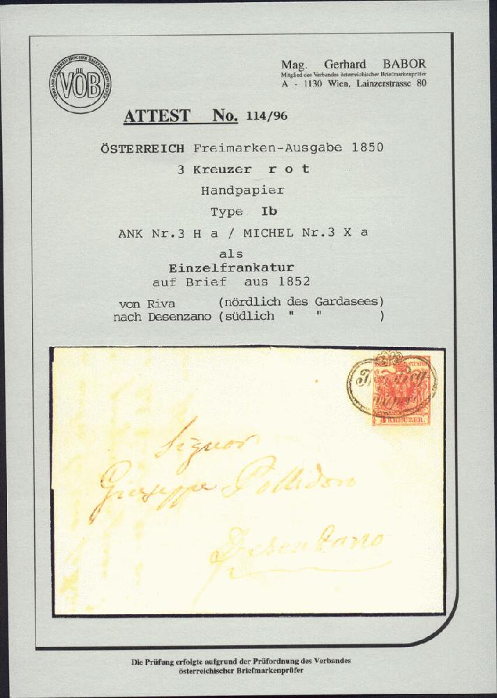 | Zusatzinformationen und Suchstichworte: | Merkurphila 49. Auktion Auktionstermin: 10. - 11. Juni 2022 Los 568 Österreich Abstempelungen Südtirol Österreich, 1850, Südtirol, IMP. REG. VAPORI, 225 p, besonders klarer Stempelabschlag, 3 H I, 3 kr, rosa, im Zwergschnitt auf Brief mit Inhalt nach DESENZANO 1852, Registerbüge im Briefpapier idealisiert, attraktives Stück!, Attest Mag. Babor Ausruf 50,00 EUR |