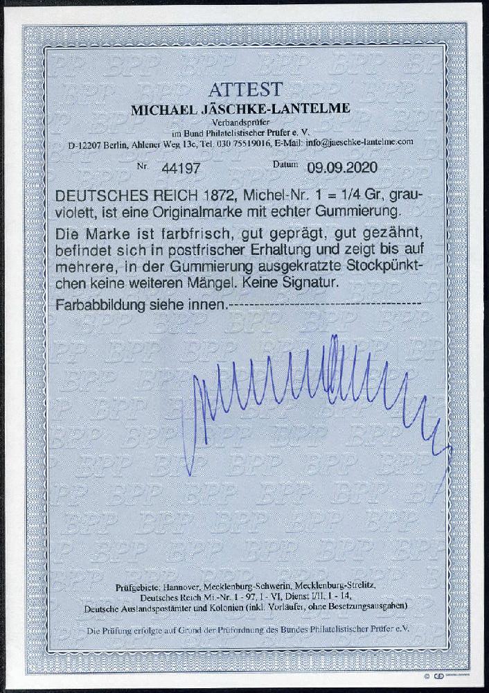 | Zusatzinformationen und Suchstichworte: | 73. AAK Phila GmbH Auktion Auktionstermin: 7. Mai 2022 Los 2433 (D) Deutsches Reich, 1872 Kleiner Brustschild 1/4 Gr kl. Schild, postfr. Pracht m. neuestem FA Jäschke-L. BPP "echt, farbfrisch, gut gezähnt u. geprägt, postfrisch bis auf mehrere in der Gummierung ausgekratzte Stockpünktchen keine weiteren Mängel", R, optisch sehr schönes Stück! Katalogpreis: 1600,- EUR Zuschlag 310,00 EUR |