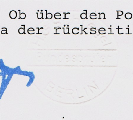 | Zusatzinformationen und Suchstichworte: | Neben der Unterschrift Prägedruckstempel als Kreisstegstempel: H. G. Schlegel / Bundesprüfer / BERLIN |