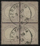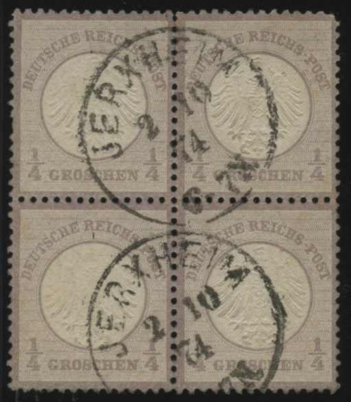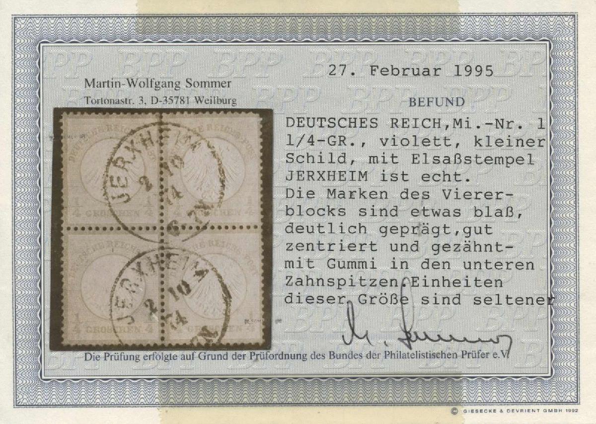 | Zusatzinformationen und Suchstichworte: | 8. Tiergarten Briefmarken und Münzen Auktion Auktionstermin: 01. Juli 2022 Los 124 Deutsches Reich, 1872 Kleiner Brustschild 1/4 Groschen violett, Viererblock mit Elsaßstempel Jerxheim, deutlich geprägt, gut zentriert und gezähnt, Prachtstück in seltener Einheit, Fotobefund Sommer BPP Ausruf 250,00 EUR |
