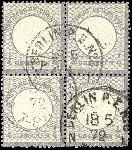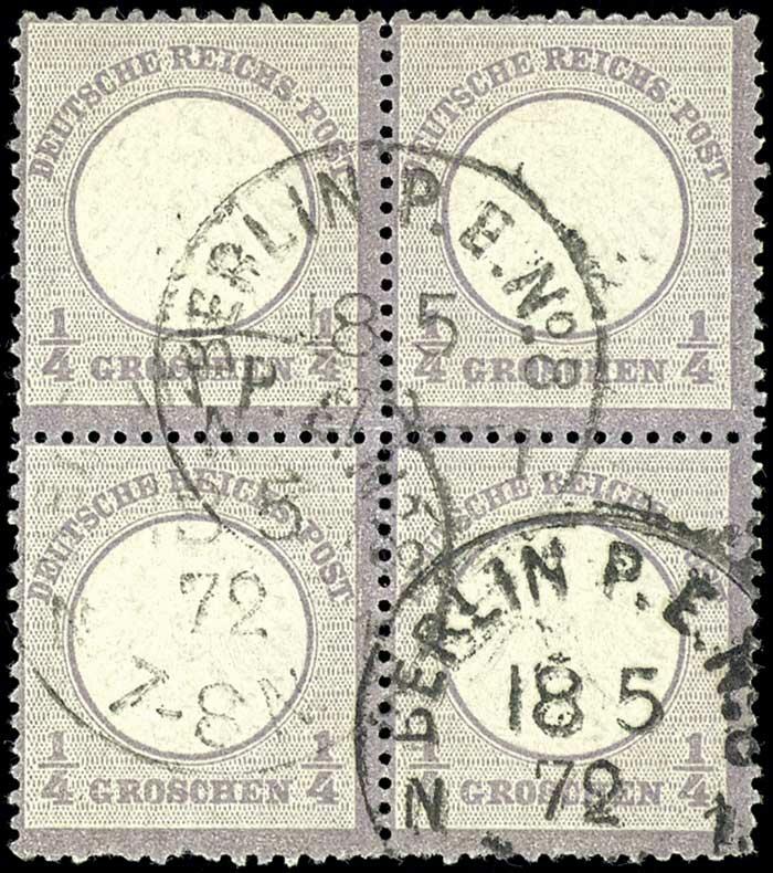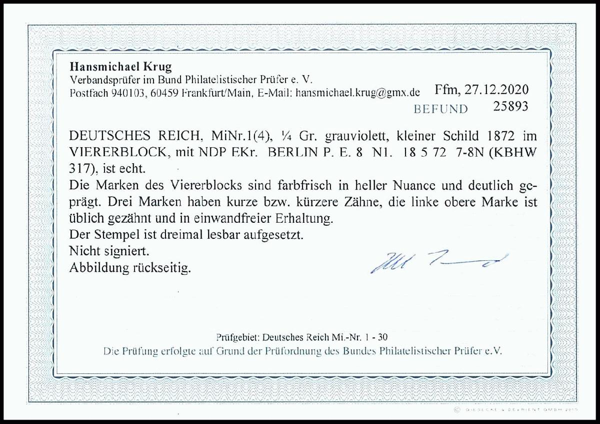 | Zusatzinformationen und Suchstichworte: | Dr. Reinhard Fischer 187. Auktion Auktionstermin: 15. Juli 2022 Los 1531 Deutsches Reich, 1872 Kleiner Brustschild 1/4 Groschen grauviolett, kleiner Schild, farbfrischer Viererblock in heller Nuance, entwertet mit NDP Einkreisstempel "Berlin P. E. 8 N1 18 5 72 7-8N" (KBHW 317), drei Marken kurze bzw. kürzere Zähne, die andere einwandfrei, Fotobefund Krug BPP (2020), Mi. 800.- Ausruf 120,00 EUR |