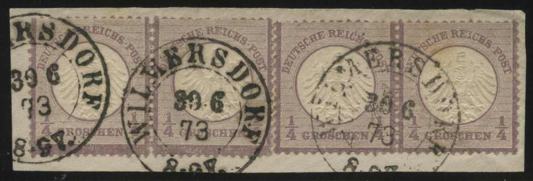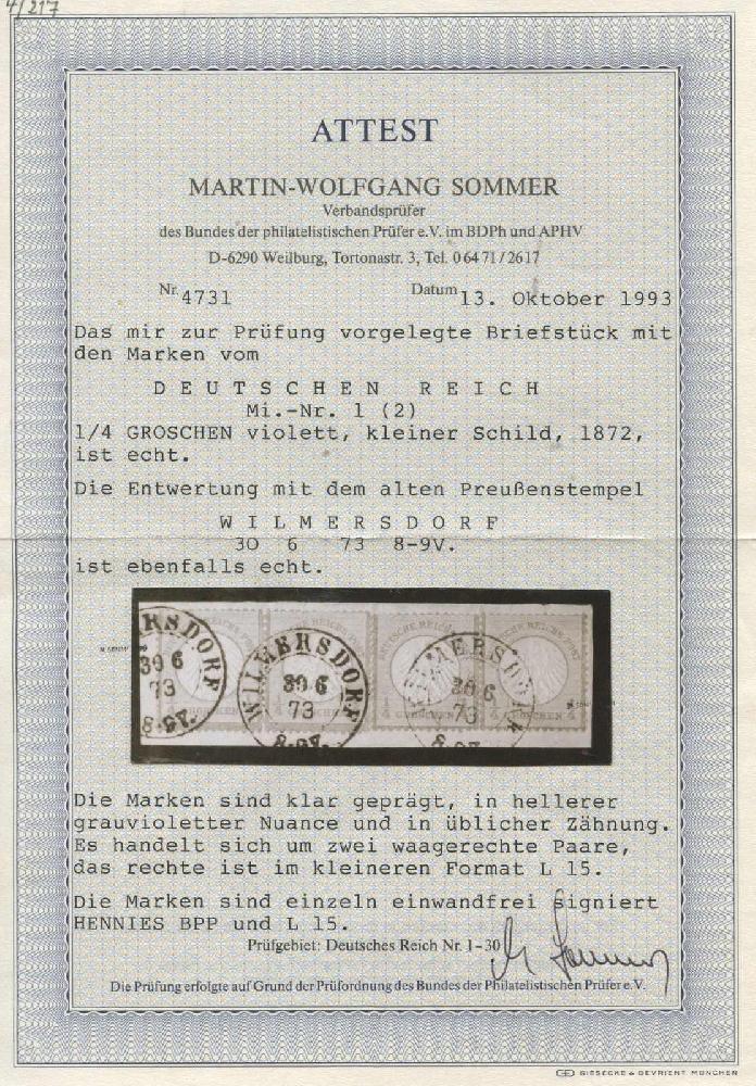 | Zusatzinformationen und Suchstichworte: | 8. Tiergarten Briefmarken und Münzen Auktion Auktionstermin: 01. Juli 2022 Los 125 Deutsches Reich, 1872 Kleiner Brustschild 1/4 Groschen hellere grauviolette Nuance, klar geprägt, 2 waagerechte Paare zum Streifen geklebt, rechtes Paar im kleinerem Format L 15, sauber entwertet mit dem alten Preussenstempel Wilmersdorf, die Marken sind einwandfrei, geprüft Hennies BPP und Fotoattest Sommer BPP Ausruf 300,00 EUR |