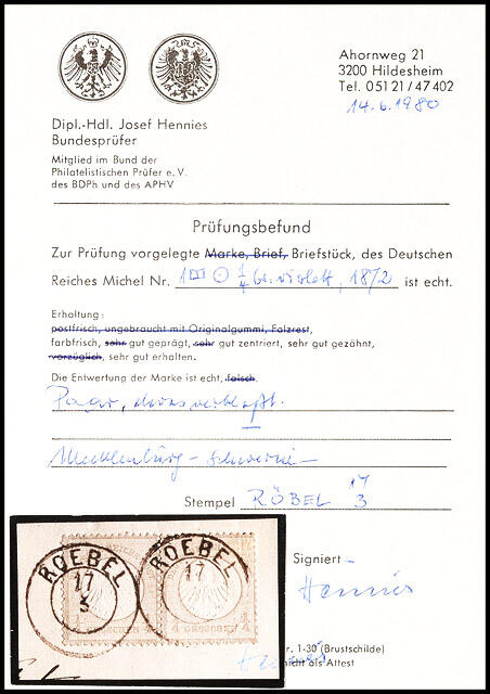 | Prüfer: | Hennies, Josef (BPP (Bund Philatelistischer Prüfer)) |