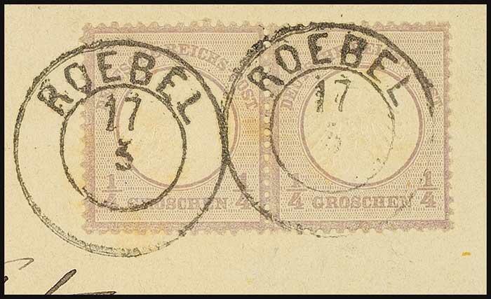 | Zusatzinformationen und Suchstichworte: | Dr. Reinhard Fischer 187. Auktion Auktionstermin: 15. Juli 2022 Los 1528 Deutsches Reich, 1872 Kleiner Brustschild 1/4 Gr. kleiner Schild grauviolett, etwas verblasstes waager. Paar auf Briefstück mit Mecklenburg-Schwerin-Stempel "ROEBEL 17 3" auf Briefstück, Fotobefund Hennies BPP, Mi. 280.- Ausruf 30,00 EUR |