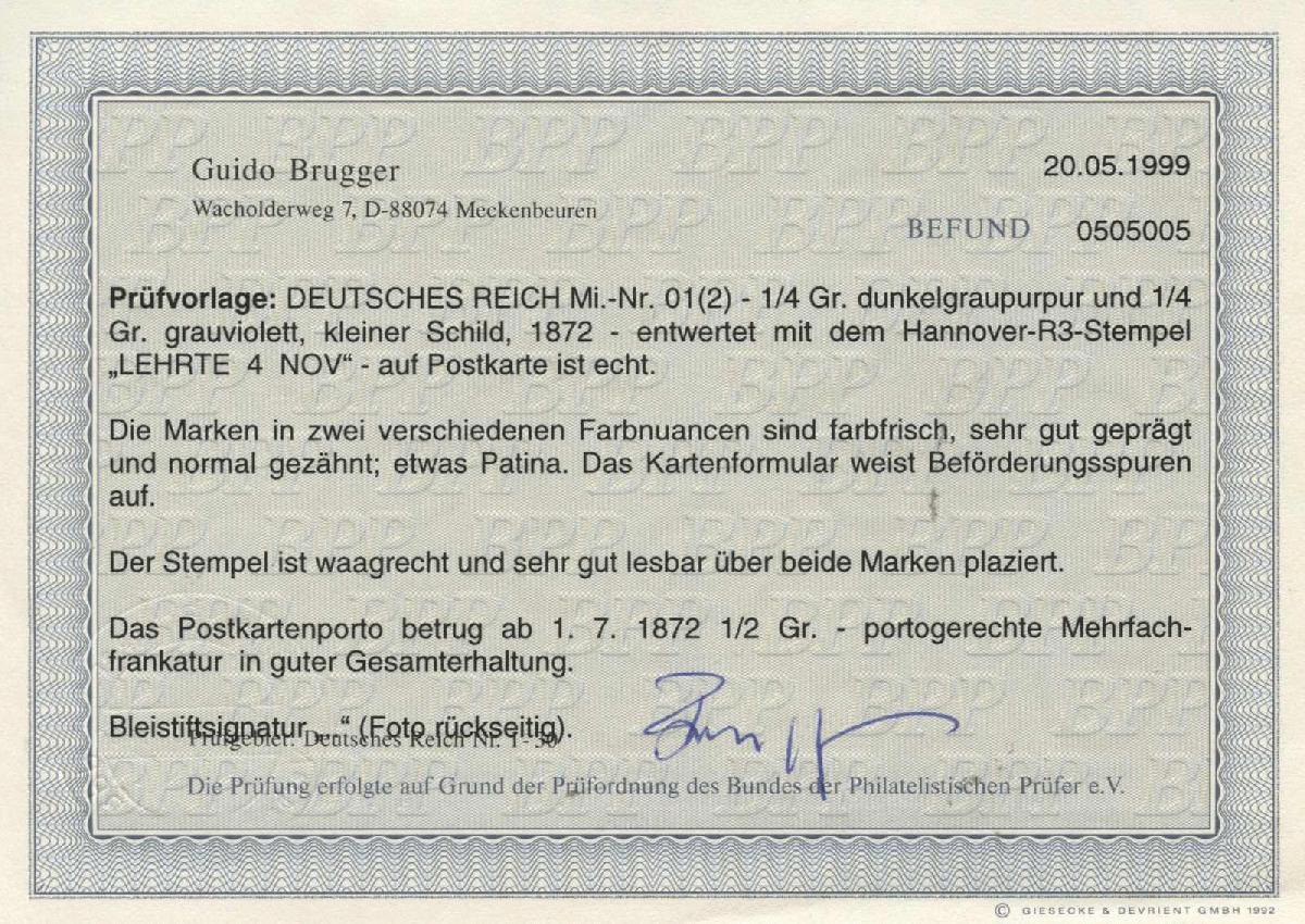 | Prüfgebiet: | Deutsches Reich 1871 - 1918 (Mi-Nr. 1 - 106) |
