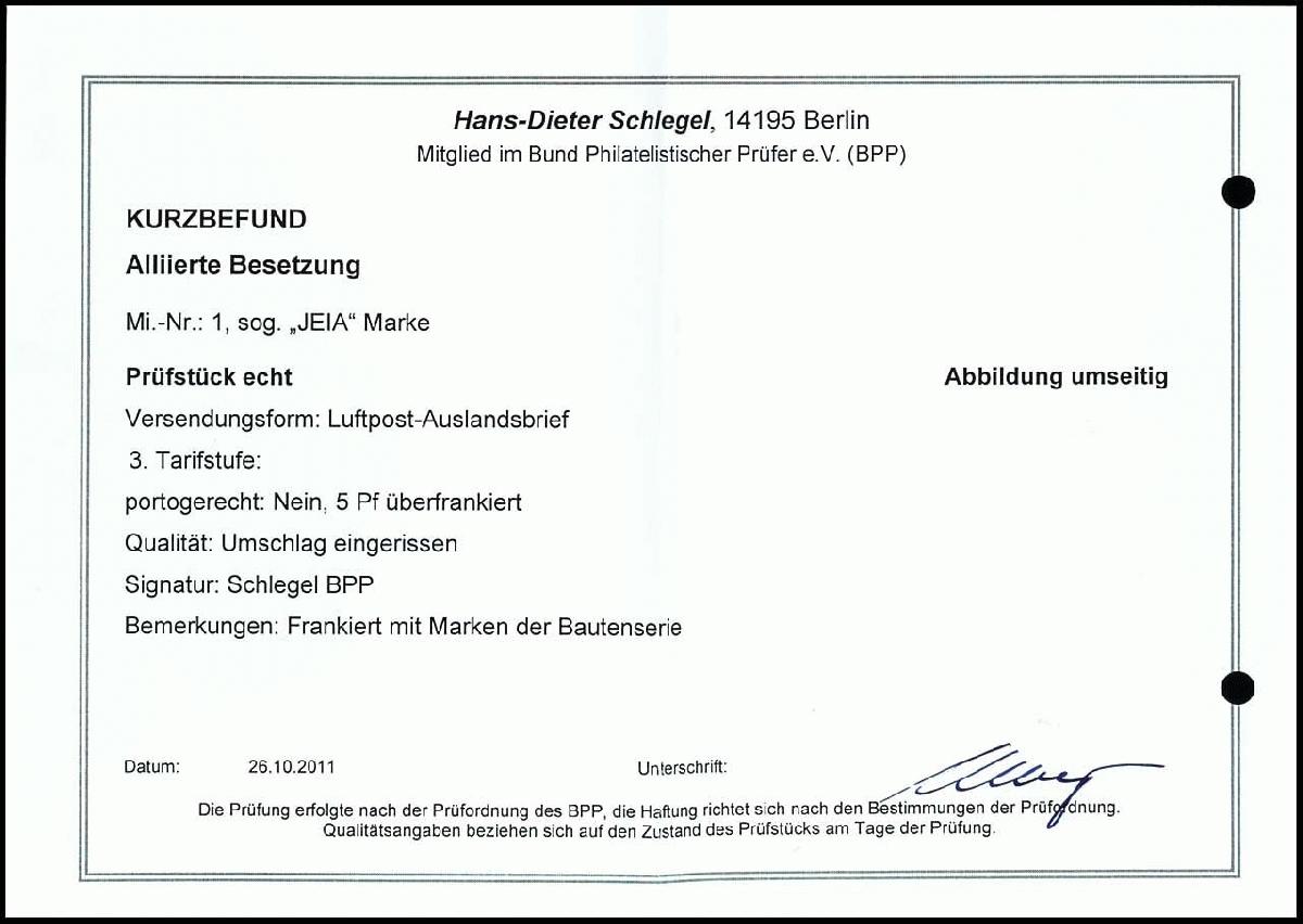 | Prüfgebiet: | Alliierte Besetzung Bizone Flugpost-Zulassungsmarke |