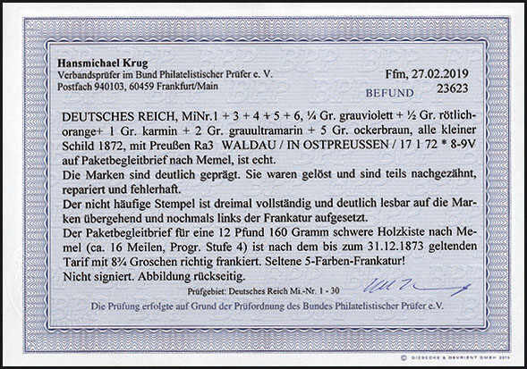 | Zusatzinformationen und Suchstichworte: | Götz 398. Auktion Auktionstermin: 22. - 23. Juni 2022 Los 2754 Deutsches Reich, 1872 Kleiner Brustschild 1/4, 1/2, 1, 2 u. 5 Gr. Kleines Schild als attraktive u. seltene, portogerechte 5-Farben-Frankatur (Marken waren gelöst u. sind teilweise nachgezähnt bzw. ausgebessert, leichte Mängel) auf Paketbegleitbrief für eine 12 Pfd. 160 Gramm schwere Holzkiste aus Waldau, mit sauberen Ra3 entwertet nach Memel. Eine nicht häufige Frankatur! Farbfotobefund Krug Zuschlag 360,00 EUR |