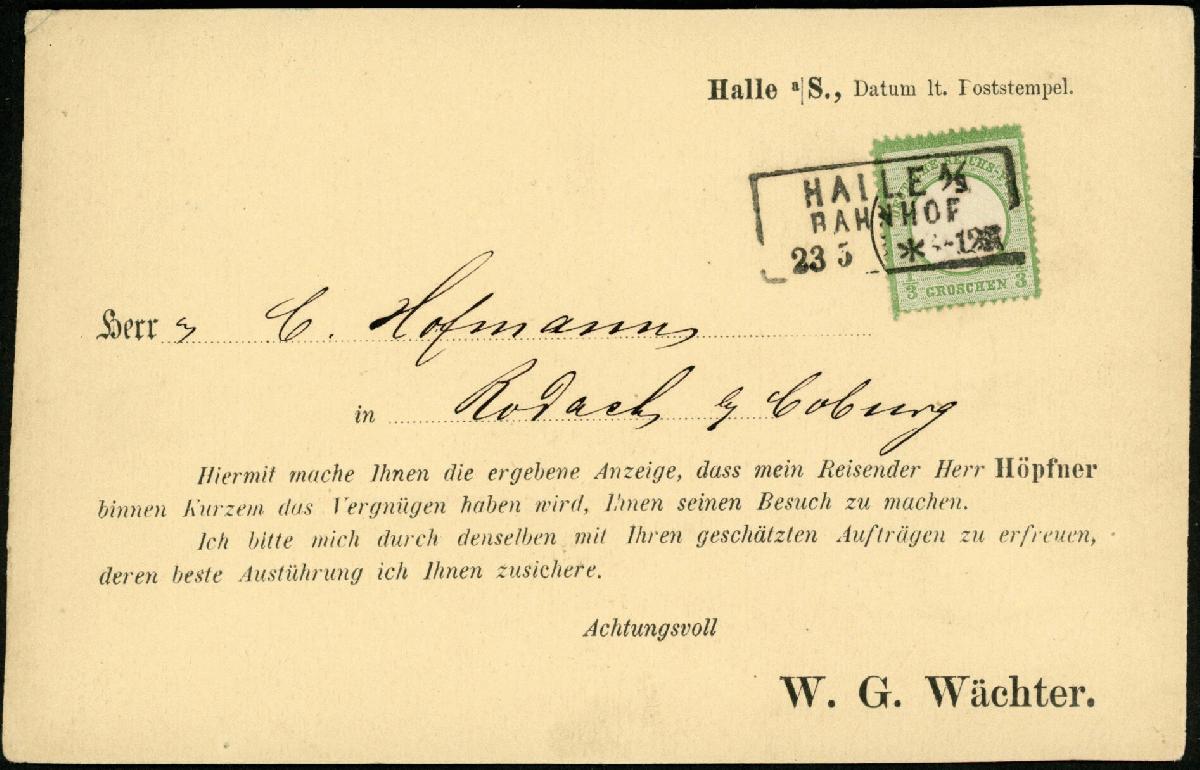 | Zusatzinformationen und Suchstichworte: | Klüttermann - 4. Auktion Auktionstermin: 28. Juli - 5. August 2022 Los 1748 Deutsches Reich, 1872 Kleiner Brustschild 1/3 Gr. dunkelsmaragdgrün als EF auf Luxus Vertreterkarre mit Ra3 HALLE A/S/BAHNHOF, FB Jäschke-L. Katalogwert: 350 Ausruf 150,00 EUR |