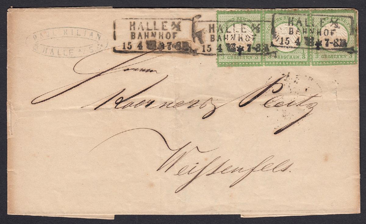 | Zusatzinformationen und Suchstichworte: | Clemens Jabs Los 0000100477 Deutsches Reich, 1872 Kleiner Brustschild BRUSTSCHILD 1/3 Groschen kleiner Schild in der guten b-Farbe "grausmaragdgrün" im senkrechten 3er Streifen auf Brief mit Ra3 HALLE A/S BAHNHOF vom 15.4.1872 nach Weißenfels. Die Beschreibung entnehmen Sie bitte dem Fotoattest Sommer BPP Festpreis 150,00 EUR |