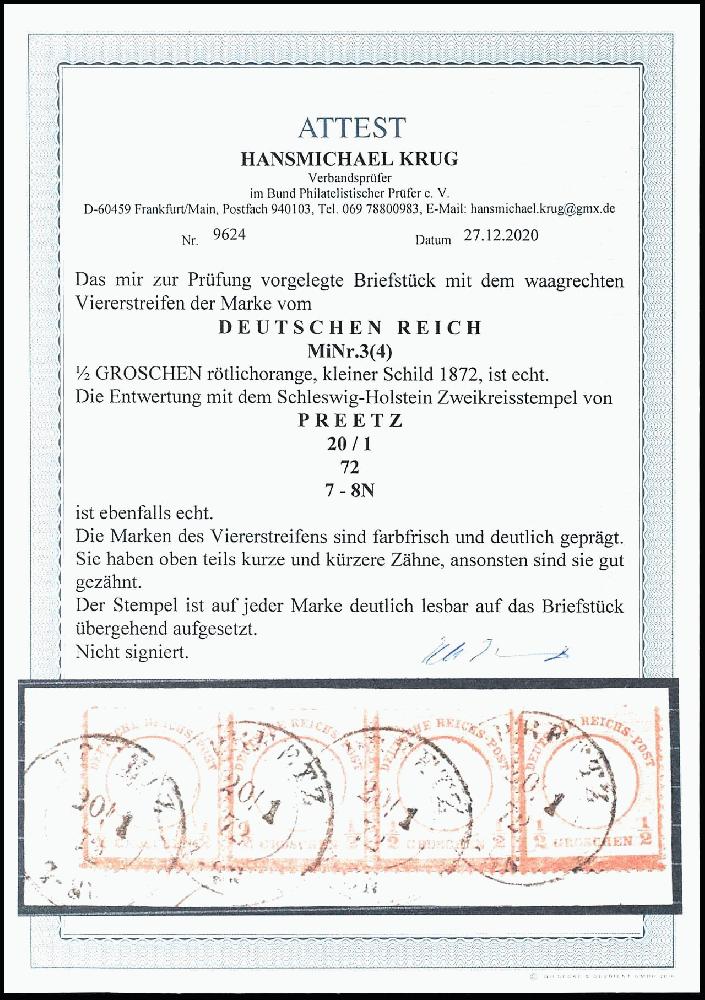 | Zusatzinformationen und Suchstichworte: | Dr. Reinhard Fischer 187. Auktion Auktionstermin: 15. Juli 2022 Los 1544 Deutsches Reich, 1872 Kleiner Brustschild 1/2 Groschen rötlichorange, kleiner Schild, farbfrischer, waagerechter Viererstreifen, entwertet mit Schleswig-Holstein Zweikreisstempel "Preetz 20/ 1 72 7-8N" auf Briefstück, teils kurze und kürzere Zähne - ansonsten tadellose Erhaltung, Fotoattest Krug BPP (2020), Mi. 900.- Ausruf 150,00 EUR |