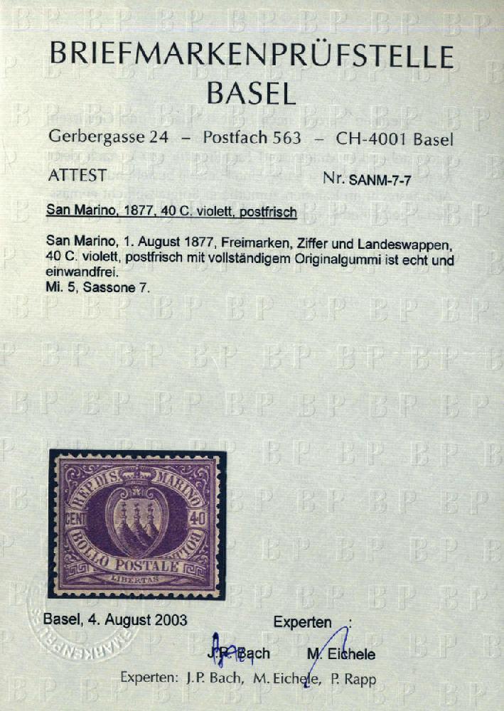 | Zusatzinformationen und Suchstichworte: | 74. AAK Phila GmbH Liquidationsauktion Auktionstermin: 17. Juli 2022 Los 896 (D) San Marino 40 C violett, postfr. Pracht m. vollem Orig´gummi m. einwandfreiem Attest BPSB, RR Ausruf 300,00 EUR |