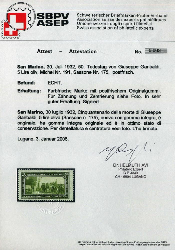 | Zusatzinformationen und Suchstichworte: | 74. AAK Phila GmbH Liquidationsauktion Auktionstermin: 17. Juli 2022 Los 907 (D) San Marino 5 L oliv, Höchstwert postfr. Luxus, gepr., sowie einwandfreies Attest Dr. Avi SBPV "sehr gute Erhaltung" Ausruf 200,00 EUR |