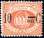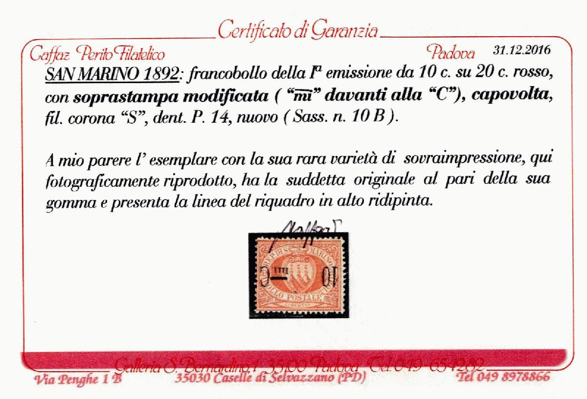 | Zusatzinformationen und Suchstichworte: | 73. Viennafil Live-Auktion Auktionstermin: 31. Mai - 3. Juni 2022 Los 1616 San Marino 1892, 10 c. su 20 c. rosso con soprastampa modificata mi davanti alla C capovolta, nuovo con gomma originale, cert. Caffaz, linea del riquadro ridipinta in alto, undici esemplari noti, Sass. 10 B / 28000,- Ausruf 2.500,00 EUR |