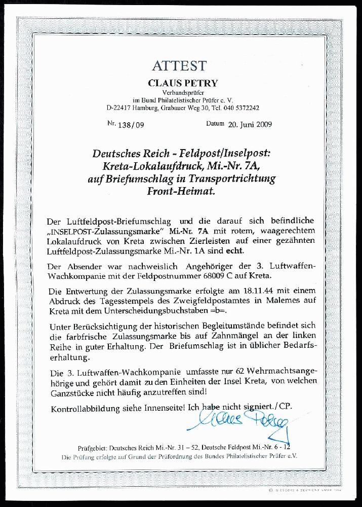 | Zusatzinformationen und Suchstichworte: | Dr. Reinhard Fischer 187. Auktion Auktionstermin: 15. Juli 2022 Los 5144 Feldpost II Wk 1944, Inselpost, Feldpostbrief vom 18.11.44 nach Leipzig mit gezähnter Inselpostmarke mit Lokalaufdruck von Kreta auf Luftfeldpost-Zulassungsmarke sowie mit Absenderangabe Feldpost-Nr. 68009 C = 3.Luftwaffen-Wach-Kp. auf der Insel Kreta, der Brief ist am Unterrand beschnitten und dürfte mit dem 5.Inselpostflug am 12.12.1944 aus Kreta ausgeflogen worden sein, Foto-Attest Petry, Mi. 700.- Ausruf 130,00 EUR |