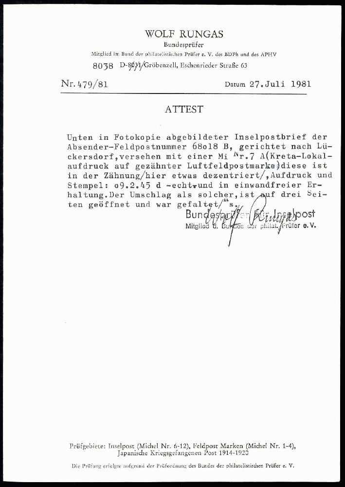 | Zusatzinformationen und Suchstichworte: | Dr. Reinhard Fischer 187. Auktion Auktionstermin: 15. Juli 2022 Los 5152 Feldpost II Wk 1945, Inselpost, Feldpostbrief vom 9.2.45 nach Lückersdorf in Sachsen mit gezähnter Inselpostmarke mit Lokalaufdruck von Kreta auf Luftfeldpost-Zulassungsmarke sowie mit Absenderangabe Feldpost-Nr. 68018 B = 2.Kraftf.Kp.Div.Nachsch.Tr. 133 auf der Insel Kreta, der Brief dürfte mit dem 11.Inselpostflug am 16.2.1945 aus Kreta ausgeflogen worden sein, der Brief ist senkrecht gefaltet und an den Seitenrändern beschnitten, Foto-Attest Rungas, Mi. 700.- Ausruf 120,00 EUR |