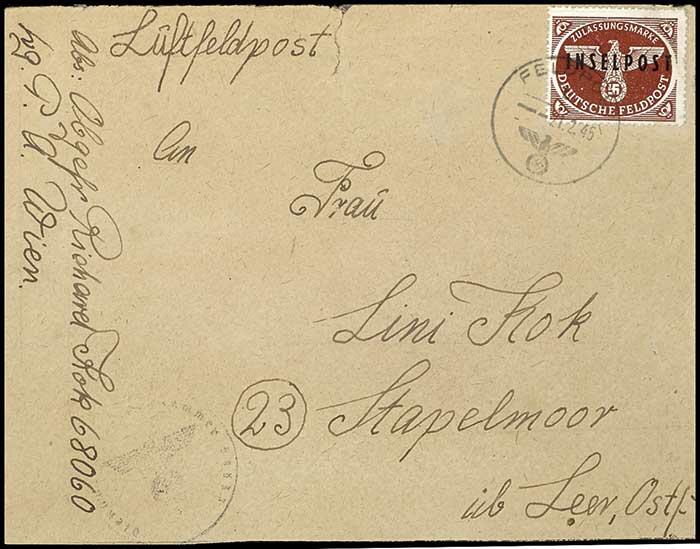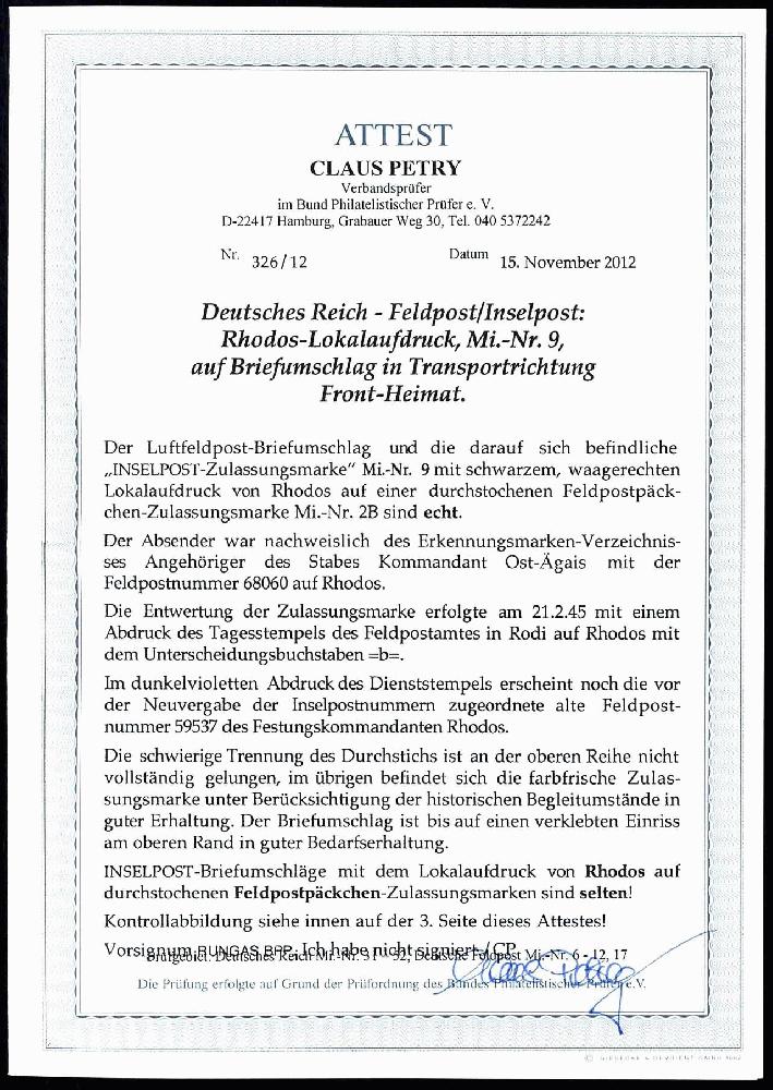 | Zusatzinformationen und Suchstichworte: | Dr. Reinhard Fischer 187. Auktion Auktionstermin: 15. Juli 2022 Los 5155 Feldpost II Wk 1945, Inselpost, Feldpostbrief vom 21.2.45 mit durchstochener Inselpostmarke mit waagerechtem Lokal-Aufdruck von Rhodos auf Feldpostpäckchen-Zulassungsmarke nach Stapelmoor in Ostfriesland sowie mit Dienst-Stpl. mit alter Feldpost-Nr. 59537 = Festungs-Kommandant Rhodos und mit Absenderangabe Feldpost-Nr. 68060 = Stab Kommandant Ostägäis auf der Insel Rhodos, der Brief dürfte mit dem 13. Inselpostflug am 26.2.1945 aus Rhodos ausgeflogen worden sein, der Brief hat am Oberrand einen verklebten Einriss, ansonsten Bedarfserhaltung, Fotoattest Petry, selten, Mi. 1.200.- Ausruf 350,00 EUR |