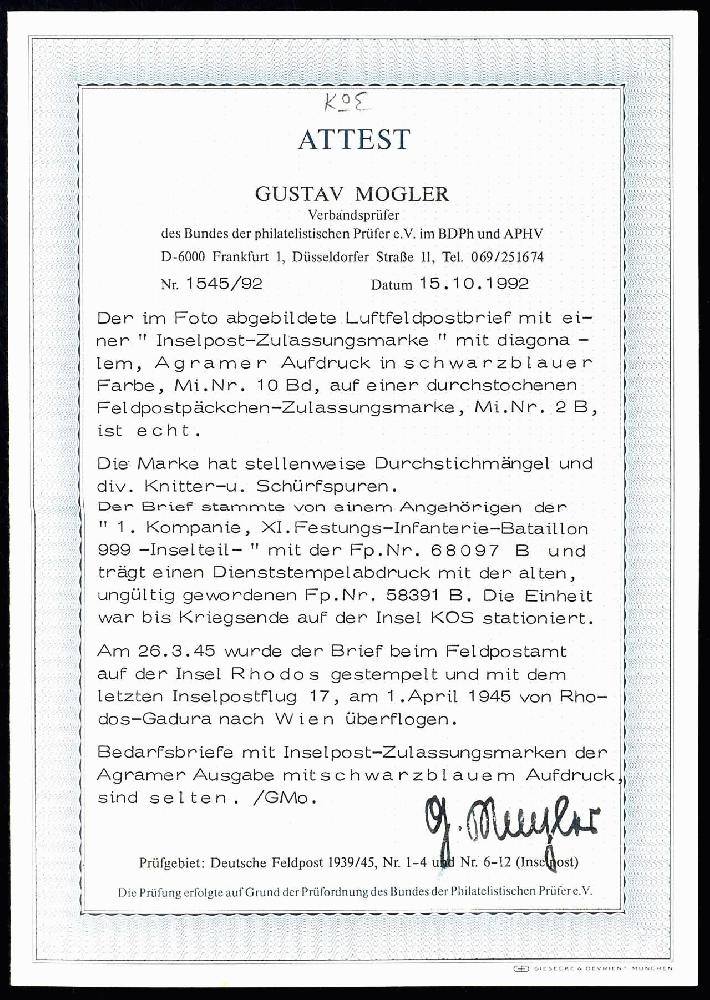 | Zusatzinformationen und Suchstichworte: | Dr. Reinhard Fischer 187. Auktion Auktionstermin: 15. Juli 2022 Los 5192 Feldpost II Wk1945, Inselpost, Feldpostbrief vom 26.3.45 mit durchstochener Inselpostmarke mit Agramer Aufdruck in schwarzblauer Farbe sowie mit Dienst-Stpl. mit alter Feldpost-Nr. 58391 B und Absenderangabe Feldpost-Nr. 68097 B = 1.Kp.XI.Festungs-Inf.Btl. 999 auf der Insel Kos, der Brief dürfte mit dem 17.Inselpostflug am 1.4.1945 aus Rhodos ausgeflogen worden sein, der Brief ist senkrecht gefaltet und am Unterrand beschnitten und verklebt, ansonsten aber gute Bedarfserhaltung, Foto-Attest Mogler, selten, Mi. 1.200.- Ausruf 350,00 EUR |