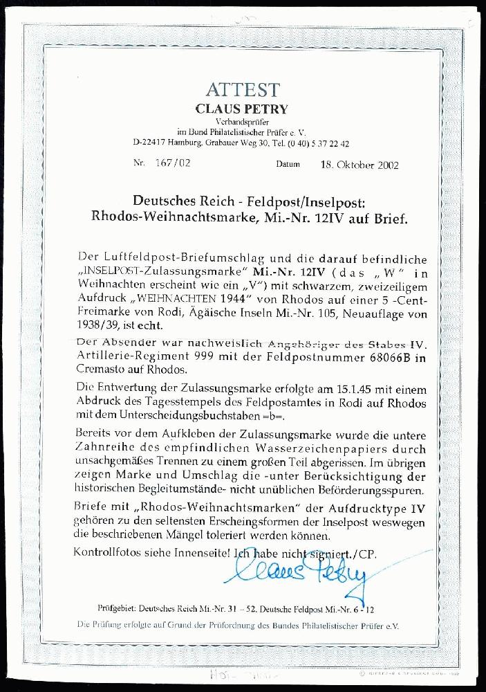 | Zusatzinformationen und Suchstichworte: | Dr. Reinhard Fischer 187. Auktion Auktionstermin: 15. Juli 2022 Los 5195 Feldpost II Wk 1945, Inselpost, Feldpostbrief vom 15.1.45 nach Meissen in Sachsen mit Inselpostmarke mit Aufdruck "WEIHNACHTEN 1944" in Type IV auf Freimarke von Rodi sowie mit Absenderangabe Feldpost-Nr. 68066 B = Stab IV Art.Rgt. 999 auf der Insel Rhodos; der Brief ist zweiseitig geöffnet und an der Unterseite beschnitten, von der Zulassungsmarke wurde die untere Zahnreihe durch unsachgemäßes Trennen zu einem großen Teil abgerissen, da aber Inselpostbriefe mit der Weihnachtsmarke in Type IV zu den seltensten Erscheinungsformen der Inselpost gehören, können diese Mängel toleriert werden; der Brief dürfte mit dem 10. Inselpostflug am 28.1.1945 von Rhodos ausgeflogen worden sein, Fotoattest Hanfried Müller, Mi. 7.500.- Ausruf 1.000,00 EUR |