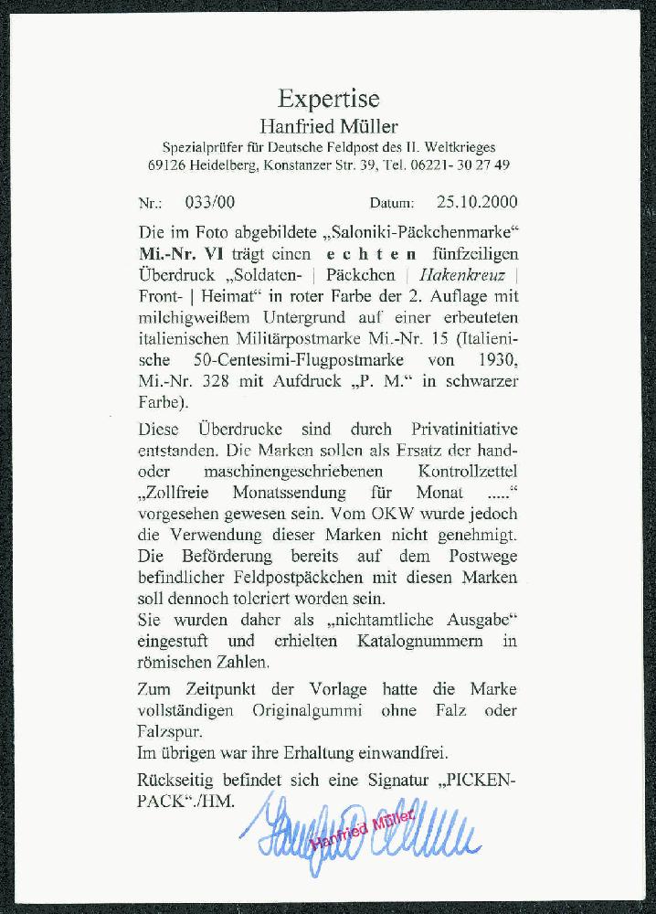 | Zusatzinformationen und Suchstichworte: | Gert Müller 114. Auktion Auktionstermin: 25. Mai 2022 Los 2053 Feldpost II Wk 50 C. schwarzsiena, Saloniki-Feldpäckchenmarke, farbfrisch und tadellos postfr. Fotoattest "EINWANDFREI" Müller. Mi. 1200,- €. Zuschlag 600,00 EUR |