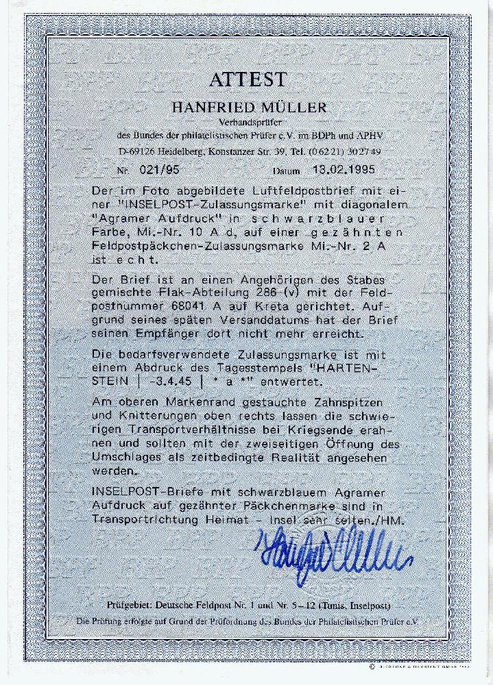| Zusatzinformationen und Suchstichworte: | Georg Bühler 28. Fern-Auktion Auktionstermin: 28. April 2022 Los 3482 Feldpost II Wk EF auf Brief Heimat-Front, aufgrund des späten Versanddatums 3.4.45 hat der Brief seinen Empfänger auf Kreta nicht mehr erreicht, ausführl. Fotoattest Müller, sehr selt. Beleg (Katalogwert: 4500 Euro) Ausruf 1.800,00 EUR |