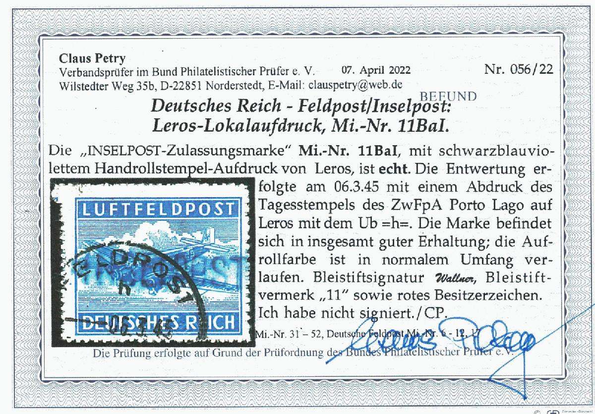 | Zusatzinformationen und Suchstichworte: | 112. Kirstein-Larisch Auktion Auktionstermin: 9. - 11. Juni 2022 Los 1197 Feldpost II Wk 1944, Insel Leros, (-) ultramarin, durchstochen, Aufdruck schwarzblauviolett, gest. Prachtstück, u.a. sign. Wallner, einwandfreies Fotoattest BPSB Basel (für Mi. 11 Bb), neuester Fotobefund Petry: "Die Marke befindet sich in guter Erhaltung." Zuschlag 155,00 EUR |