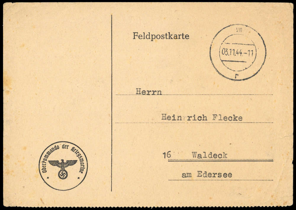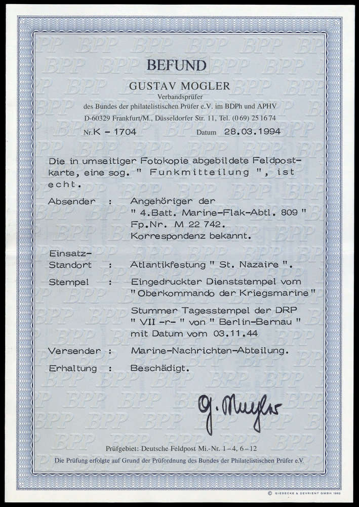 | Zusatzinformationen und Suchstichworte: | DBA Freiburg GmbH Los 1670050663 Feldpost II Wk ST. NAZAIRE: 1944, Funkmitteilungskarte mit stummem Stempel "VII 3.11.44 r" nach Waldeck, Alterungsspuren und Randrisse, Fotoattest Mogler BPP Festpreis 150,00 EUR |