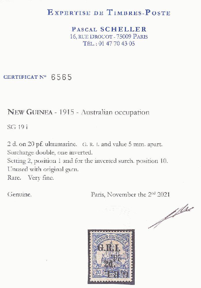 | Zusatzinformationen und Suchstichworte: | 11. classicphil GmbH Auktion Auktionstermin: 28. Mai 2022 Los 1004 Deutsche Kolonien Neuguinea Britische Besetzung 1914-15,2 d. auf 20 Pf. ultramarin, GRI und Wert 5 mm getrennt, Aufdruck Doppel- einer kopfstehend, Fassung 2, Position 1 und für die kopfstehender Aufdruck Position 10, großer Teil Originalgummi, Attest Scheller, sehr selten und tadellose Erhaltung, CV £4750, Kabinett! Schätzpreis 5,700 EUR Zuschlag 1,400.00 EUR |