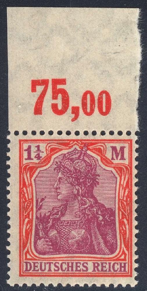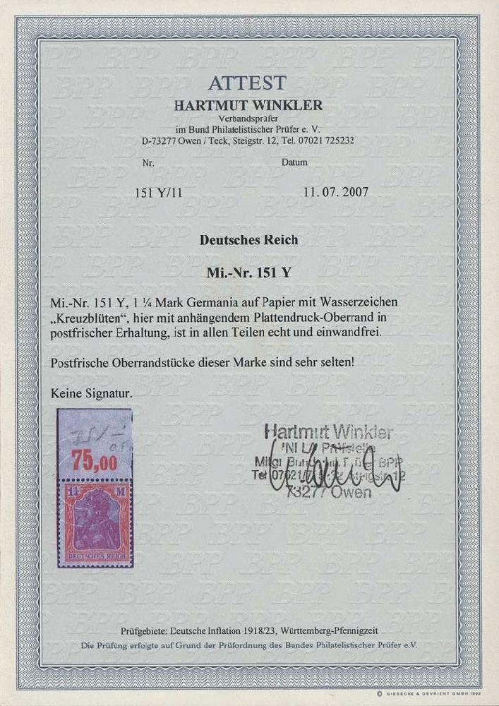 | Zusatzinformationen und Suchstichworte: | Uwe von Poblocki Los 0948701647 Deutsches Reich, Germania mit WZ 1920, 1¼ M. Germania "Kreuzblüten", einwandfrei postfrisches ungefaltetes Oberrandstück vom Plattendruck mit dem seltenem Fiskal-"Vierpass"Wasserzeichen, die marke war im OR etwas bleistiftbeschriftet, wie auf dem Attest noch erkennbar, was aber aus optischen Gründen weitgehend wegradiert wurde, ohne Signaturen(!) mit Fotoattest Winkler BPP "echt und einwandfrei", Oberrandstücke dieser Ausgabe sind ausgesprochen selten! (Mi€ 3.500,-) Festpreis 1.450,00 EUR |