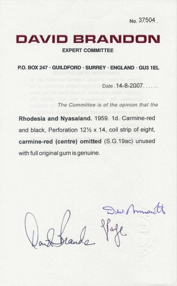 | Zusatzinformationen und Suchstichworte: | Doreen Royan & Associates Shop - Online Los 750985 (D) Rhodesien und Nyassaland Rhodesia and Nyasaland 1954-1962 Queen Elizabeth II ‘VHF Mast’. 1d. carmine-red and black. Vertical coil strip (Perf. 12½ x 14) of eight. Error, ‘Carmine-red (centre) omitted’. Superb unmounted mint condition. Brandon Certificate (2007). VERY RARE Preis auf Anfrage |