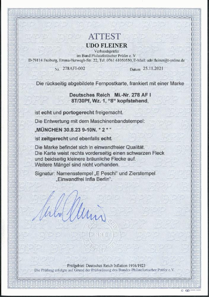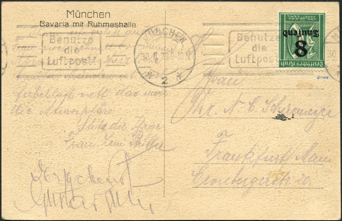 | Zusatzinformationen und Suchstichworte: | 108. Briefmarken Lenz Auktion Auktionstermin: 29. April - 5. Mai 2022 Los 6777 Deutsches Reich, 1918/23 Inflationsausgaben 1923, 8 Tsd. M. Freimarke, mit Aufdruckfahler "8 kopfstehend", auf Karte(etwas fleckig) aus "München 30.8.23" nach Frankfurt, Echt und portogerecht, Attest Fleiner Ausruf 150,00 EUR |
