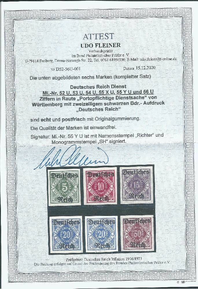 | Zusatzinformationen und Suchstichworte: | Rauhut & Kruschel - 212. Auktion Auktionstermin: 30. Juli 2022 Los 3122 Deutsches Reich Dienst-Ausgabe für Württemberg vollständig postfrisch in der seltenen geschnittenen Variante, dabei 20 Pfg. in beiden Wasserzeichen, Attest Fleiner. Mi. 1650,- Ausruf 500,00 EUR |