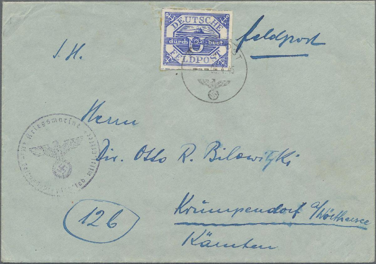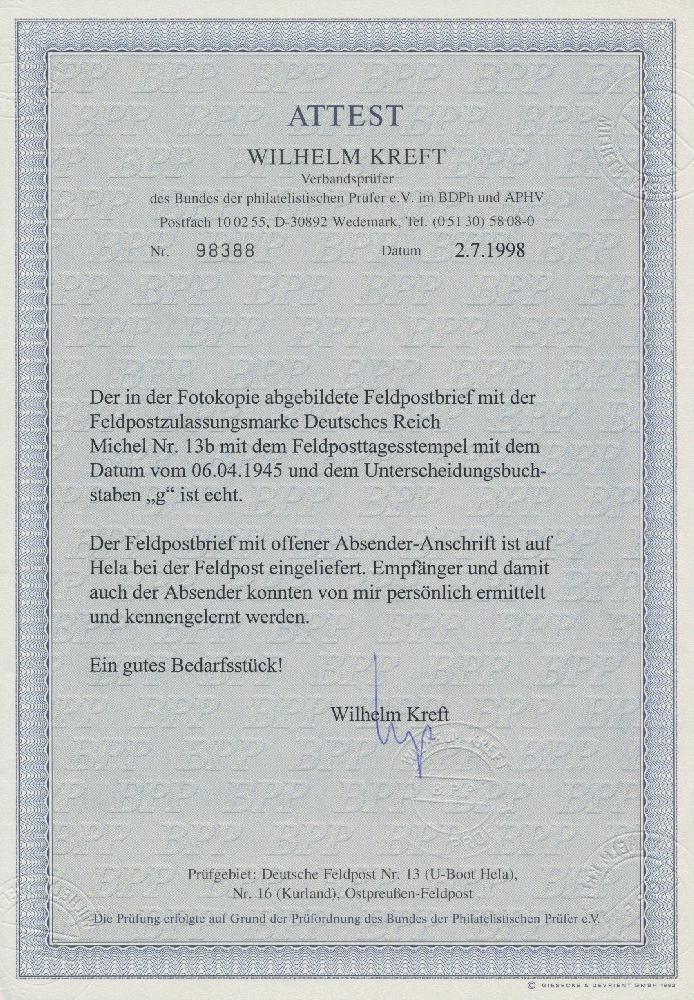 | Zusatzinformationen und Suchstichworte: | Christoph Gärtner 53. Auktion Auktionstermin: 22. Juni 2022 Los 4170 Deutsche Besetzung II. WK, Feldpostmarken 1945, U-Boot Hela-Zulassungsmarke blau, ringsum gleichmässig breitrandigs, ungemein farbfrisches und absolut tadelloses Exemplar auf überdurchschnittlich gut erhaltenem Feldpost-Bedarfsbrief mit klarem FP-Normstempel "g" (Hela Hafen) 6.4.45 in die Ostmark nach Krumpendorf am Wörthersee in Kärnten. Eine bereit seit langer Zeit registrierte Feldpost-Rarität von einem Angehörigen des Marine-Festungs-Pionierstabes Hela, wozu sowohl Absender als auch Adressat nach dem Krieg ermittelt und befragt werden konnten. Feldpostrarität ersten Ranges von untadeliger Provinienz, Atteste Kreft BPP und Gabisch BPP. Los zurückgezogen Ausruf 10.000,00 EUR |