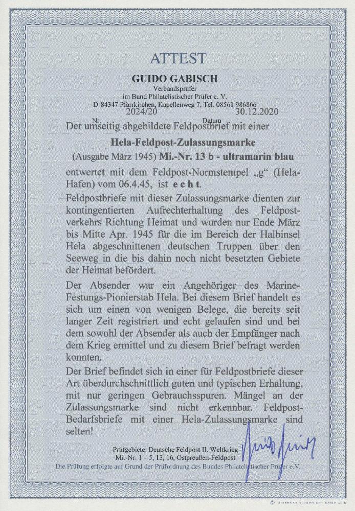 | Zusatzinformationen und Suchstichworte: | Christoph Gärtner 53. Auktion Auktionstermin: 22. Juni 2022 Los 4170 Deutsche Besetzung II. WK, Feldpostmarken 1945, U-Boot Hela-Zulassungsmarke blau, ringsum gleichmässig breitrandigs, ungemein farbfrisches und absolut tadelloses Exemplar auf überdurchschnittlich gut erhaltenem Feldpost-Bedarfsbrief mit klarem FP-Normstempel "g" (Hela Hafen) 6.4.45 in die Ostmark nach Krumpendorf am Wörthersee in Kärnten. Eine bereit seit langer Zeit registrierte Feldpost-Rarität von einem Angehörigen des Marine-Festungs-Pionierstabes Hela, wozu sowohl Absender als auch Adressat nach dem Krieg ermittelt und befragt werden konnten. Feldpostrarität ersten Ranges von untadeliger Provinienz, Atteste Kreft BPP und Gabisch BPP. Los zurückgezogen Ausruf 10.000,00 EUR |