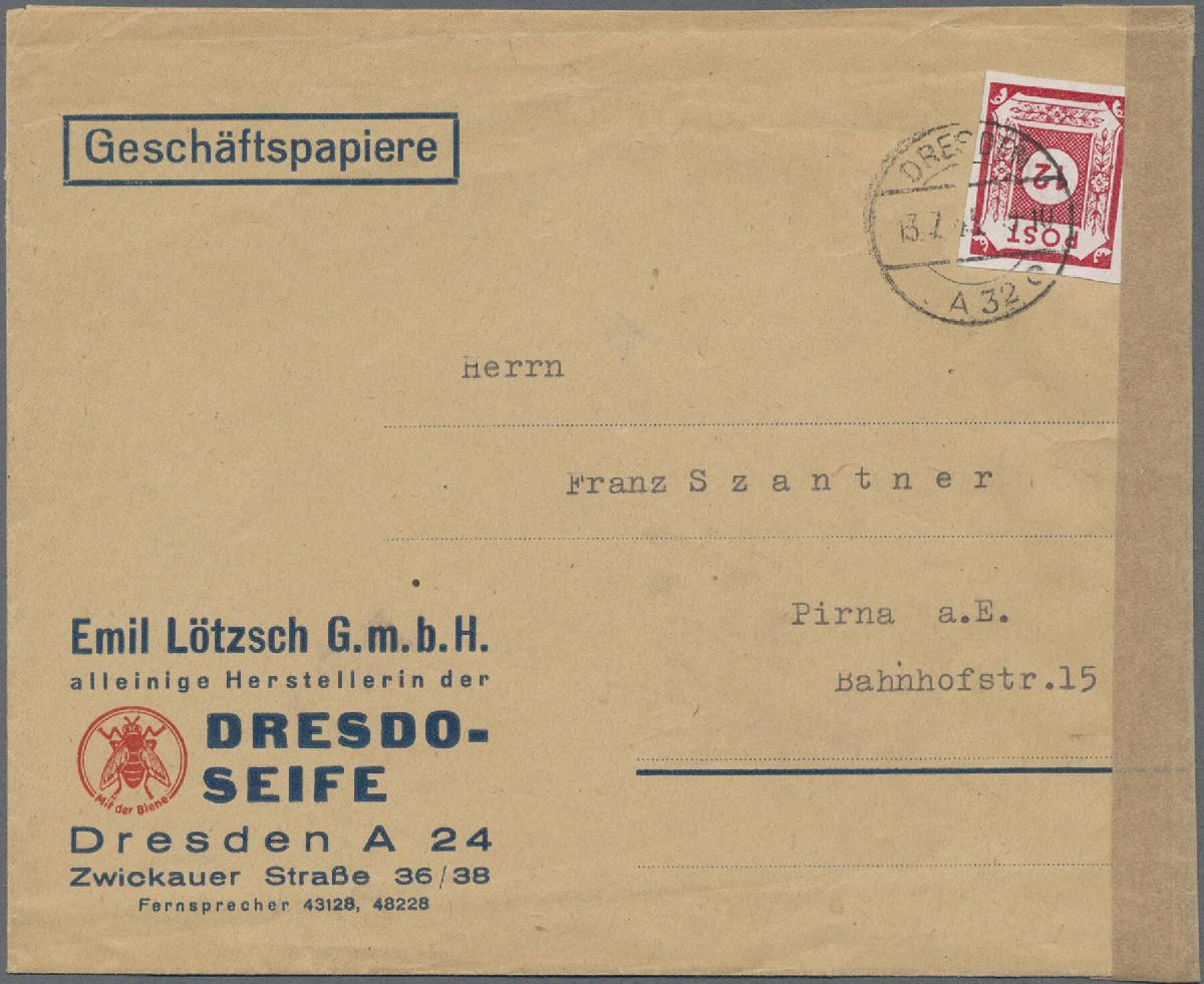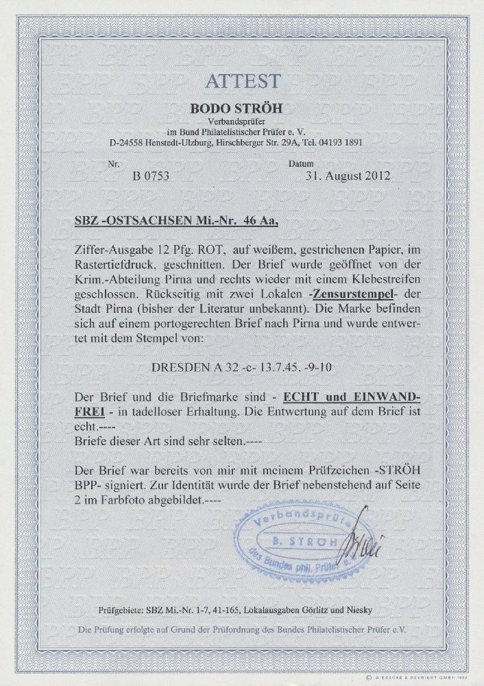 | Zusatzinformationen und Suchstichworte: | Christoph Gärtner 53. Auktion Auktionstermin: 22. Juni 2022 Los 4270 SBZ Ostsachsen 1945, 13. Juli, 12 Pfg rot, ungezähnt, Ziffer im Kreis (Inschrift nur deutsch), tarifgerechte Einzelfrankatur auf beidseits bedrucktem Geschäfts-Brief ("Geschäftspapiere") von Dresden nach Pirna an der Elbe (rückseitig Zensur-Stempel "Stadt Pirna" da - gemäss handschriftlichem Vermerk - von der "Krim. Abtlg" geöffnet und mit Klebestreifen wieder verschlossen), signiert und geprüft mit Photo-Attest Ströh BPP (2012) Ausruf 150,00 EUR |