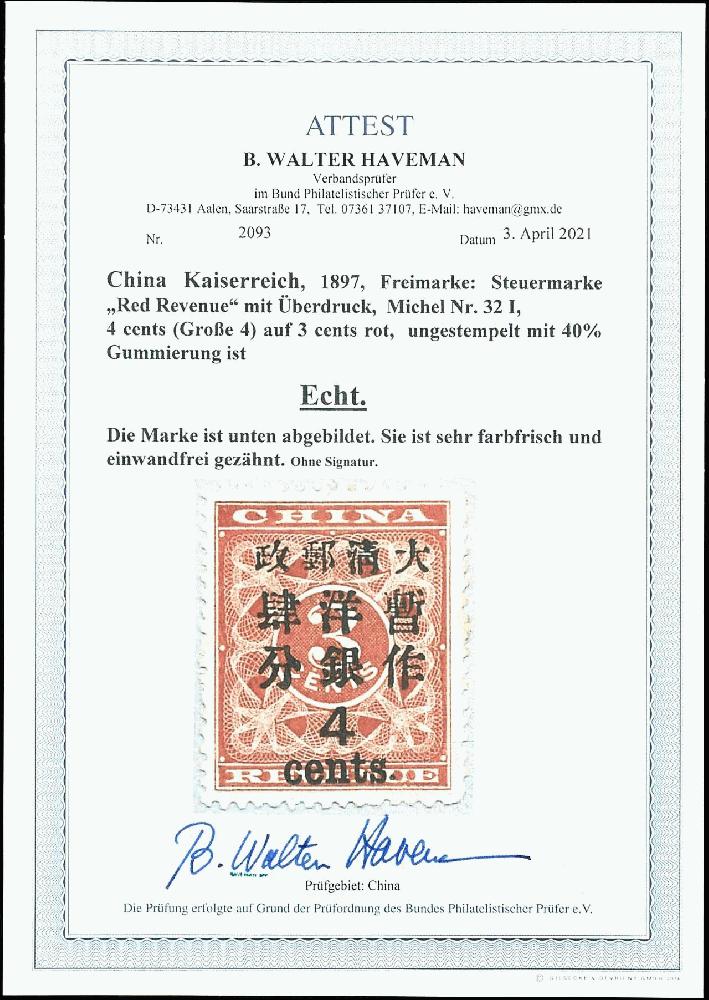 | Zusatzinformationen und Suchstichworte: | Dr. Reinhard Fischer 186. Auktion Auktionstermin: 18. - 21. Mai 2022 Los 5052 China VR 1897, 4 C. auf 3 C. "Red Revenue", tadellos ungebraucht mit Originalgummierung, gut gezähnt und sehr schön farbfrisch, seltene Marke, Fotoattest Havemann BPP (2021); "... ungestempelt mit 40% Gummierung ist echt. [...] Sie ist sehr farbfrisch und einwandfrei gezähnt.", Mi. 2.500.- Zuschlag 900,00 EUR |