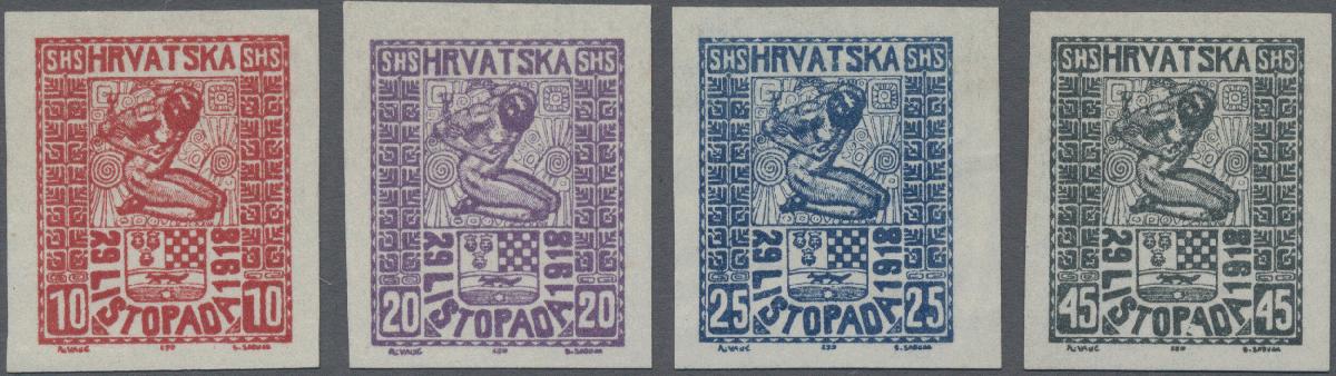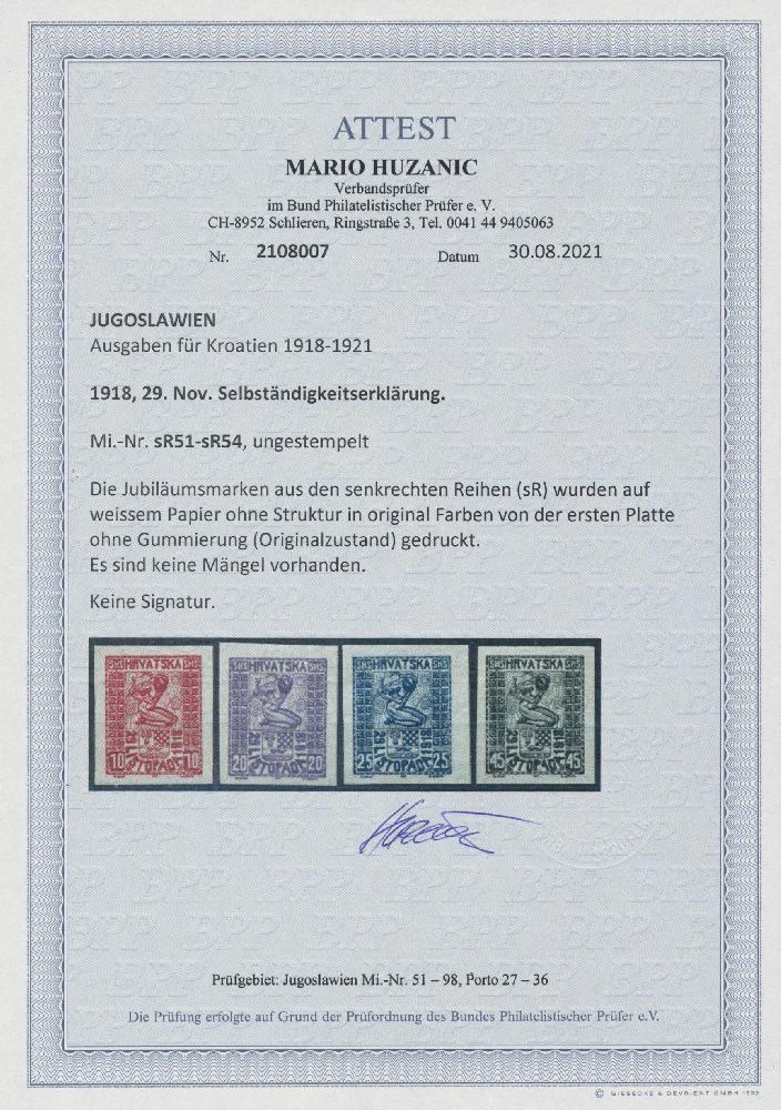 | Zusatzinformationen und Suchstichworte: | Christoph Gärtner 53. Auktion Los 2223 Jugoslawien 1918,29. Nov. Ausgabe für Kroatien, Unabhängigkeit, vier Werten, Sonderzudrucke auf weiß, ungummiert, Papier, ungezähnt. Attest Huzanic BPP Ausruf 100,00 EUR |