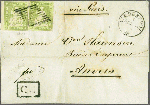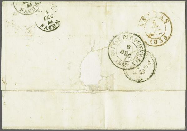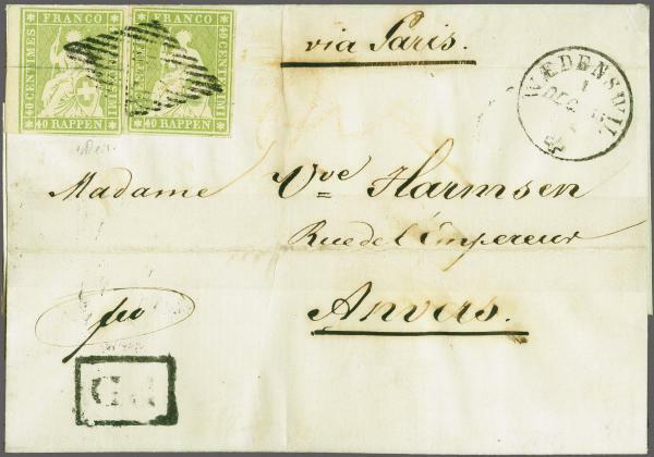| Zusatzinformationen und Suchstichworte: | 284. - 290. Corinphila Auktion Auktionstermin: 3. - 4. Juni 2022 Los 7628 Strubel - A3/A Münchner Druck 40 Rp. grünlicholiv, zwei farbfr. und allseits weissrandige Einzelwerte (waagr. Registraturbug Bug durch die Marken), einer mit Bogenrand links, zus. zart und zentr. entw. mit eidg. Raute mit nebenges. "WAEDENSWIL 4 DEC 55" und gefasstem PD auf ehemals doppelgewichtigem Faltbrief nach Antwerpen, rücks. mit Transit Zürich & Basel, belgischem Grenzübergangsstp. "SUISSE PAR QUIEVRAIN 6 DEC 1855" und Ankunftsstp. (6. Dez.). Recht seltene Destination, Attest Huzanic (2022)SBK = CHF 1'300 Zuschlag 420,00 CHF |
