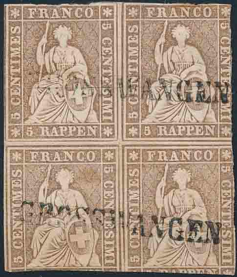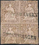| Zusatzinformationen und Suchstichworte: | 150. MH Marken Auktion Auktionstermin: 15. - 16. Juni 2022 Los 256 Strubel 3. Berner Druck dickes Papier 5 Rp.-Wert, braun, seltener 4er Block mit Schnittmängeln, Entwertet mit Stabstempel "Grosswangen", Detailliertes Attest Huzanic Ausruf 800,00 CHF |