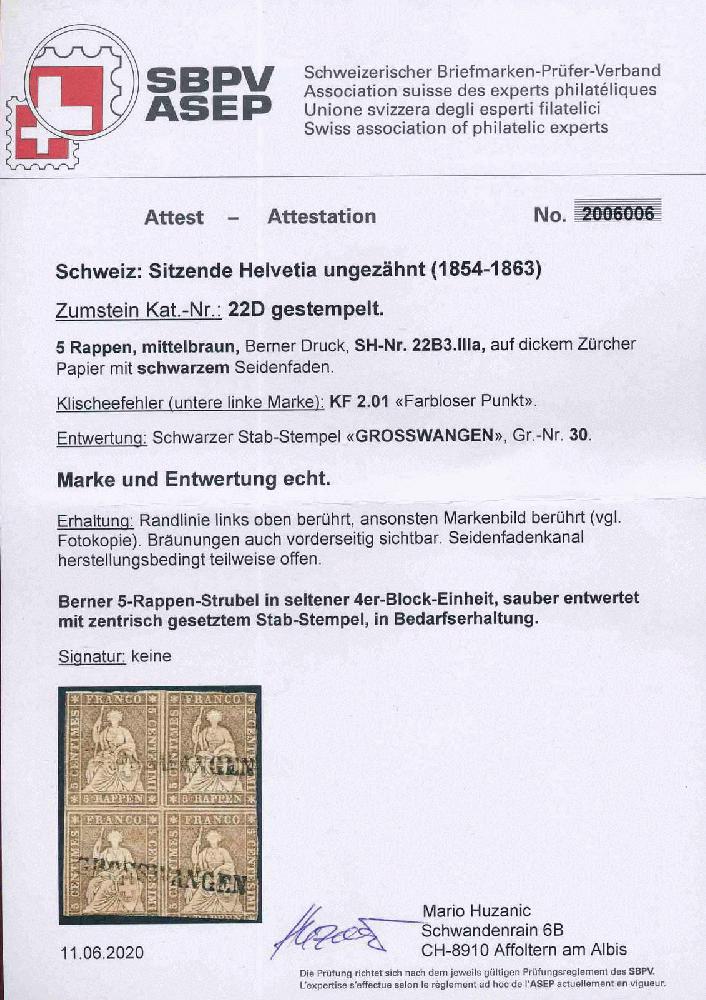| Prüfer: | Huzanic, Mario (SBPV / ASEP (Schweizerischer Briefmarken-Prüfer-Verband)) |